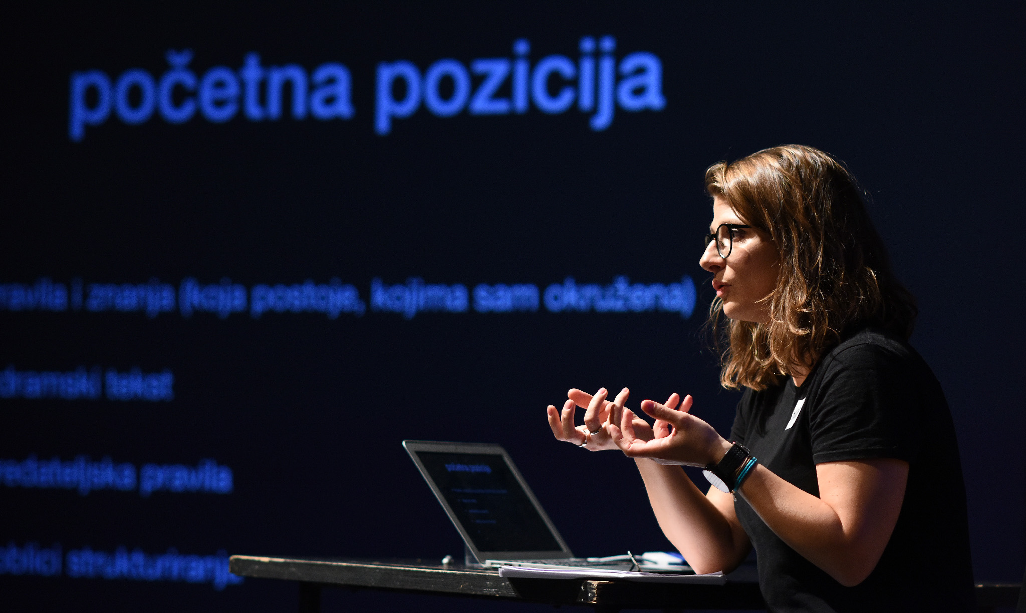 Jako rano osjetila sam potrebu raditi kazalište koje je reakcija i odgovor na svijet koji me okružuje, ali s obzirom na znanja i pravila kojima sam bila okružena, nije bilo lako dopustiti si da je ta reakcija slobodna u meni na način na koji je ja doživljavam. Klasičan tekst, dramsko pismo ili riječi jednog autora nisu me zadovoljavale, uvijek su govorile puno manje od onoga što sam htjela reći i uvijek su koristile puno više riječi nego što sam ih htjela koristiti. I tematski i izvedbeno, osjećala sam da u meni i u jeziku koji želim izraziti postoji nešto intenzivno neiskazivo. I tu je bila moja nemoć. Dugo mi je trebalo da toj nemoći pridam važnost. Na Izvedbenoj konferenciji predstavit ću proces rada na razvijanju tog jezika.