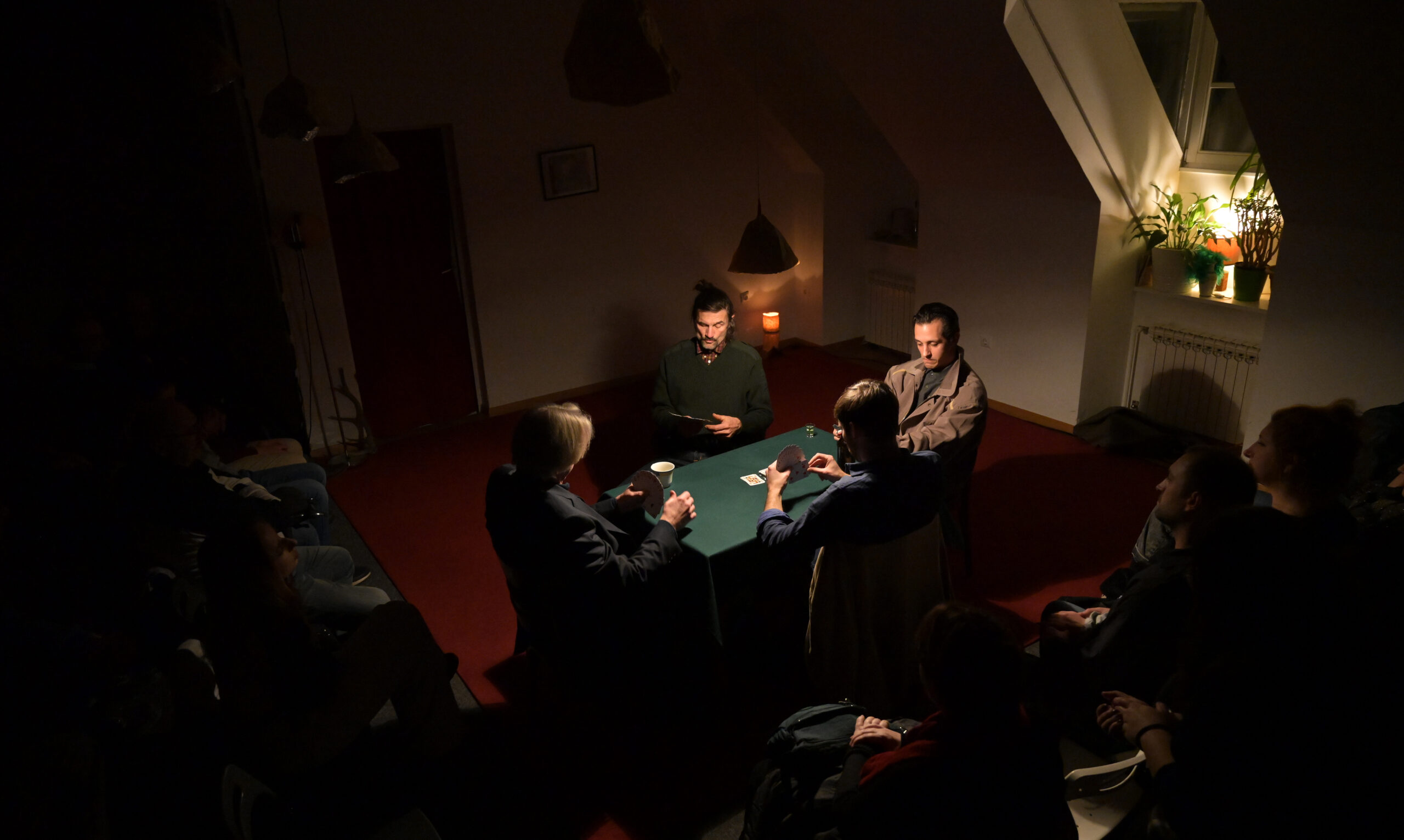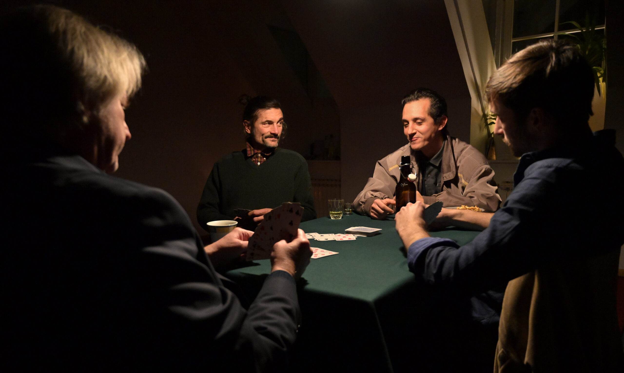 Za stolom smo četvorica – ako nismo dvojica, ako nisam sam, ako svaki od nas nije sam. Dijelimo samo karte. Igraj: baci, odgovaraj, nosi, sijeci. Nemaš aduta? Igraj, ne igraj se, ta su vremena davno prošla. Pravila su jednostavna i nemilosrdna, ali nitko se ne buni, nije to život. Naše karte nisu karte nečega, na njima nema gradova i država, brda i dolina. Nemamo previše izbora: deset brojki, četiri simbola, tri slike. Svi likovi su dvolični – osobito žene, gorko bi rekao jedan od nas – no sva su lica ista. Karta je karta kako god je okreneš. Možemo igrati šutke, ovo nisu igre riječima. Da smo na pozornici, ne bi bilo dijaloga, a svi bi monolozi bili unutarnji. Bavimo se sobom, za publiku više-manje: tko šiša kibicere, da imaju muda, i sami bi zaigrali. Možemo igrati cijelu noć čak i ako se ne poznajemo, čak i ako smo smrtni neprijatelji, osobito ako smo neprijatelji: svaki od nas igra da pobijedi, makar igrao samo da mu prođe vrijeme, da prođe što prije. Nije li pobjednik onaj koji se riješi svih karata? Kako karta padne, tako je netko odnese, igra se vrti oko prostora gdje nečega više nema. Gdje nema ničega – to svi mislimo, nitko ne izgovara. Igra se vrti gotovo kao priča, gotovo kao četiri priče navrh jezika. Ako se vrtnja dovoljno ubrza, možda se jedna otme, možda dobije glas, možda je drugi čuju. Ne dijelimo samo karte, nego i prazninu – ravnu plohu stola, hladno svjetlo koje nam prži ruke dok lica ostaju u tami. Možda, možda, možda u glavi čujemo istu daleku glazbu, neki tango na koji nitko ne pleše. Kad-tad ćemo ustati i razići se. Za vas trojicu ne znam: mene tješi što me kod kuće čeka prekinuta partija šaha s neznancem u zrcalu.